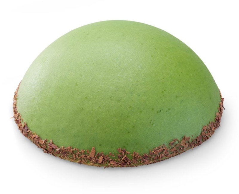 - Dunkler Biskuit mit feinstem Nougat und Pistazien-Marzipanmousse, umhüllt mit Zartbitterschokolade und eingedeckt mit Edelmarzipan