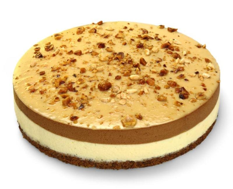 Helles und dunkles Nougatmousse mit Nougat-Crisp-Kern auf Nussboden, überzogen mit heller Nougatglasur und gerösteten Haselnüssen bestreut