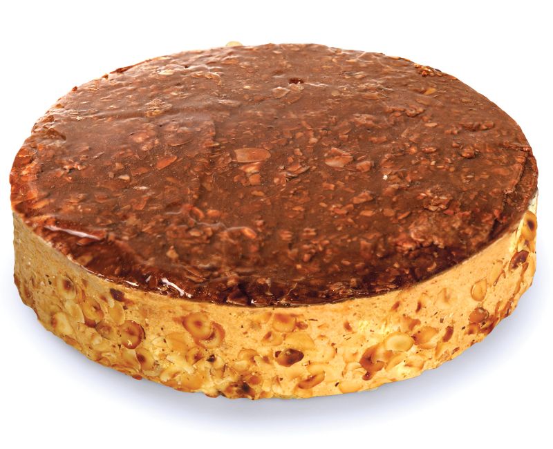 - Walnussböden, gefüllt mit Haselnussbuttercreme, mit Haselnussnougat abgeglänzt, in Haselnussbiskuit eingeschlagen.
